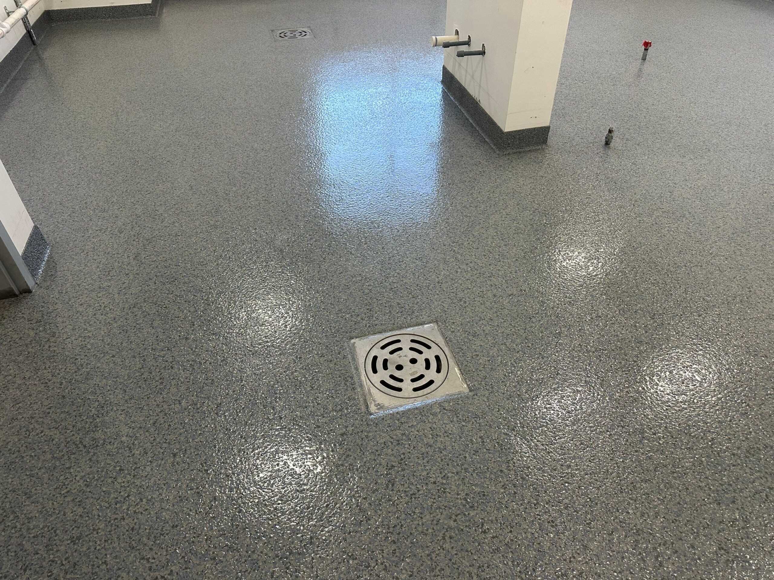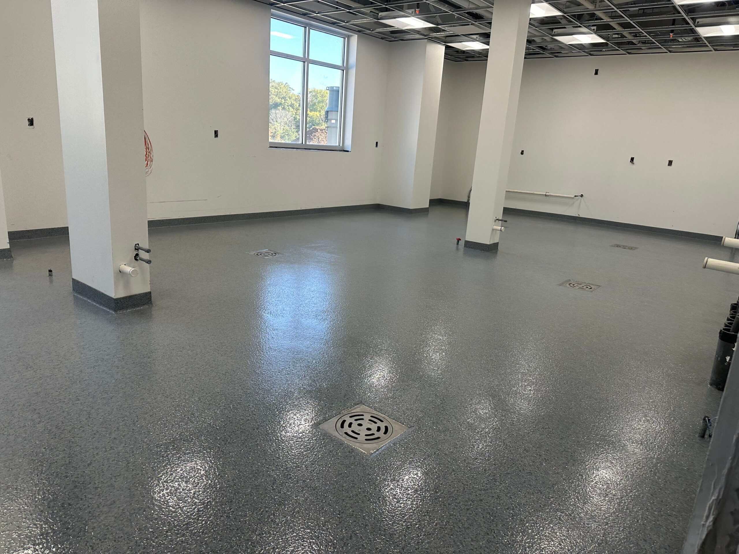 Industrial Applications mobilized highly trained crews to prepare over 6,000 square feet of new concrete to achieve the proper surface profile. We then installed a Tnemec epoxy mortar with decorative flake system, along with thousands of linear feet of 4 inch integral cove base.